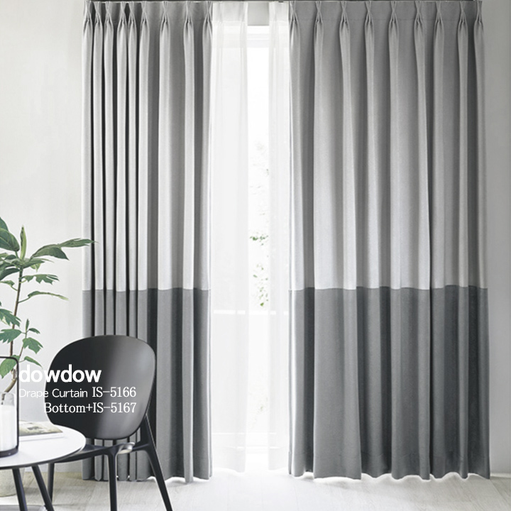 光沢糸を織り交ぜて濃淡のある艶(ツヤ)で、軽やかな表情をつくった無地の遮光カーテンのライトグレーとグレーの切替しです。