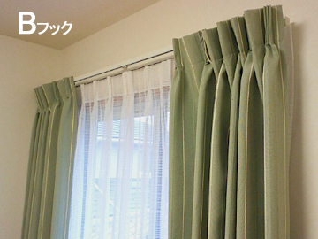 Bフックはカーテンを【閉めた時】にレールが見えないようになるので、見た目もキレイですし、光漏れも軽減しますが【カーテンを開ける】とカーテンの上部のプリーツの折り返しが反対になる為、少しボリューム感があります。