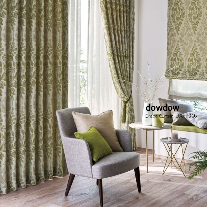 リーフ・ダマスク柄のドレープカーテン【UX-7046】グリーン