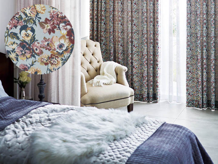 咲き誇る小さな花々が美しいマテリアルのようなゴブラン織りの【フレンチ カントリー】のドレープカーテン。