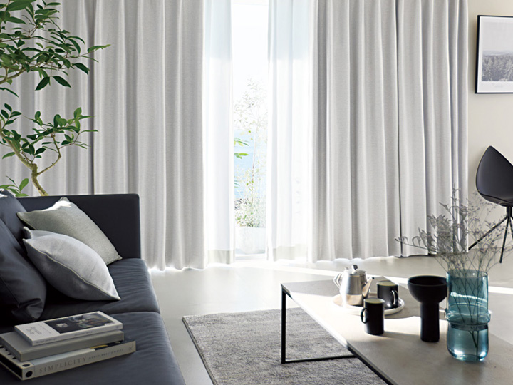グレーがかったネイビーブルーは、彩度を抑えた大人っぽい色彩です。無地のカーテンでは得られない優雅さと高級感が特長です。